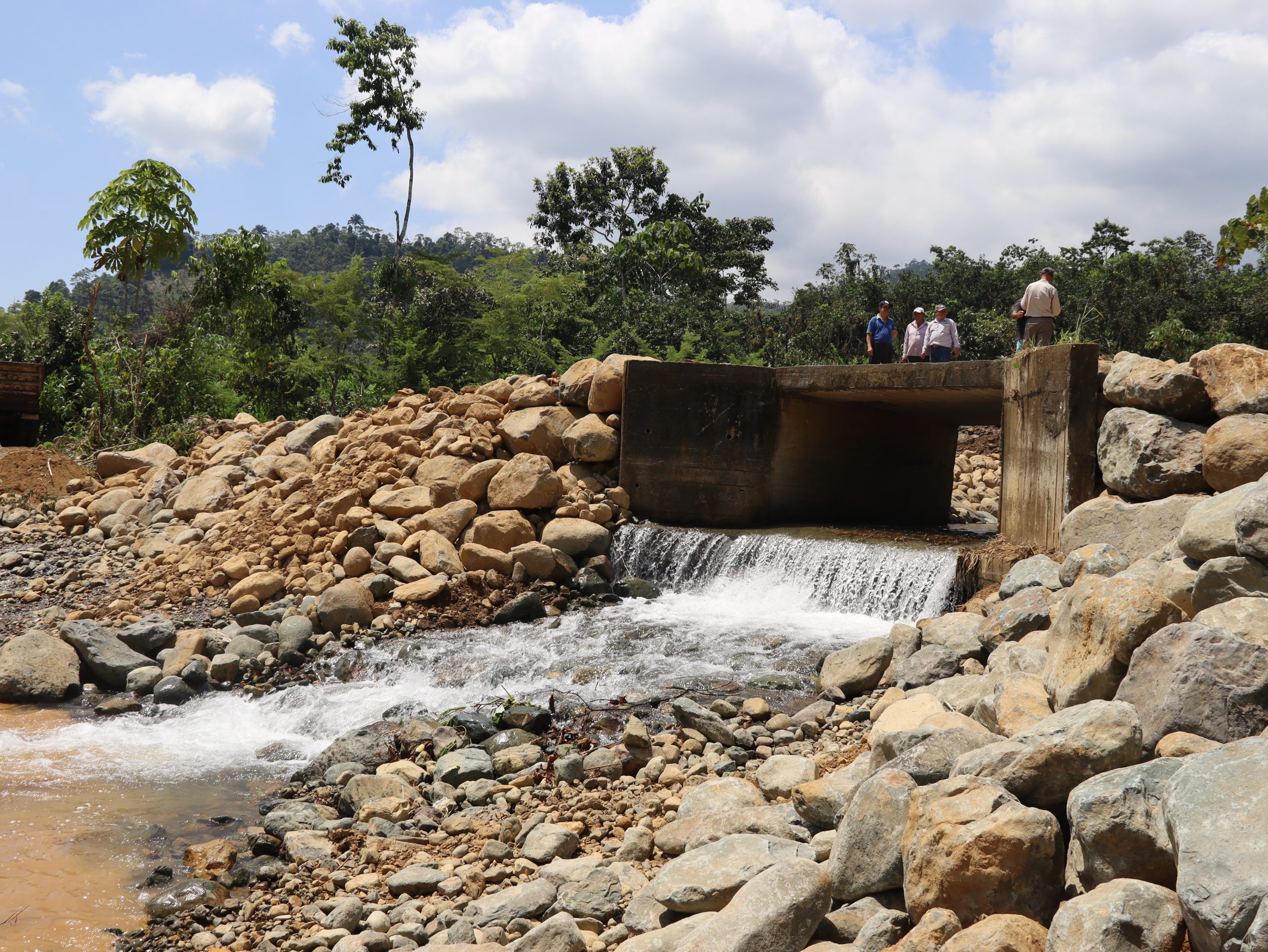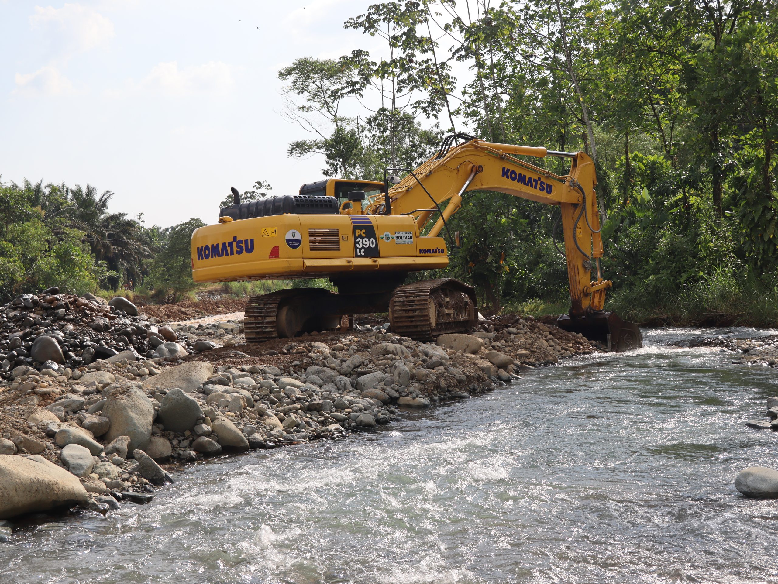 Posteriormente, en el recinto San Gabriel, perteneciente a la parroquia San José del Tambo, se ejecutan trabajos de protección del puente, orientados a garantizar la seguridad y mejorar la conectividad vial de la población.